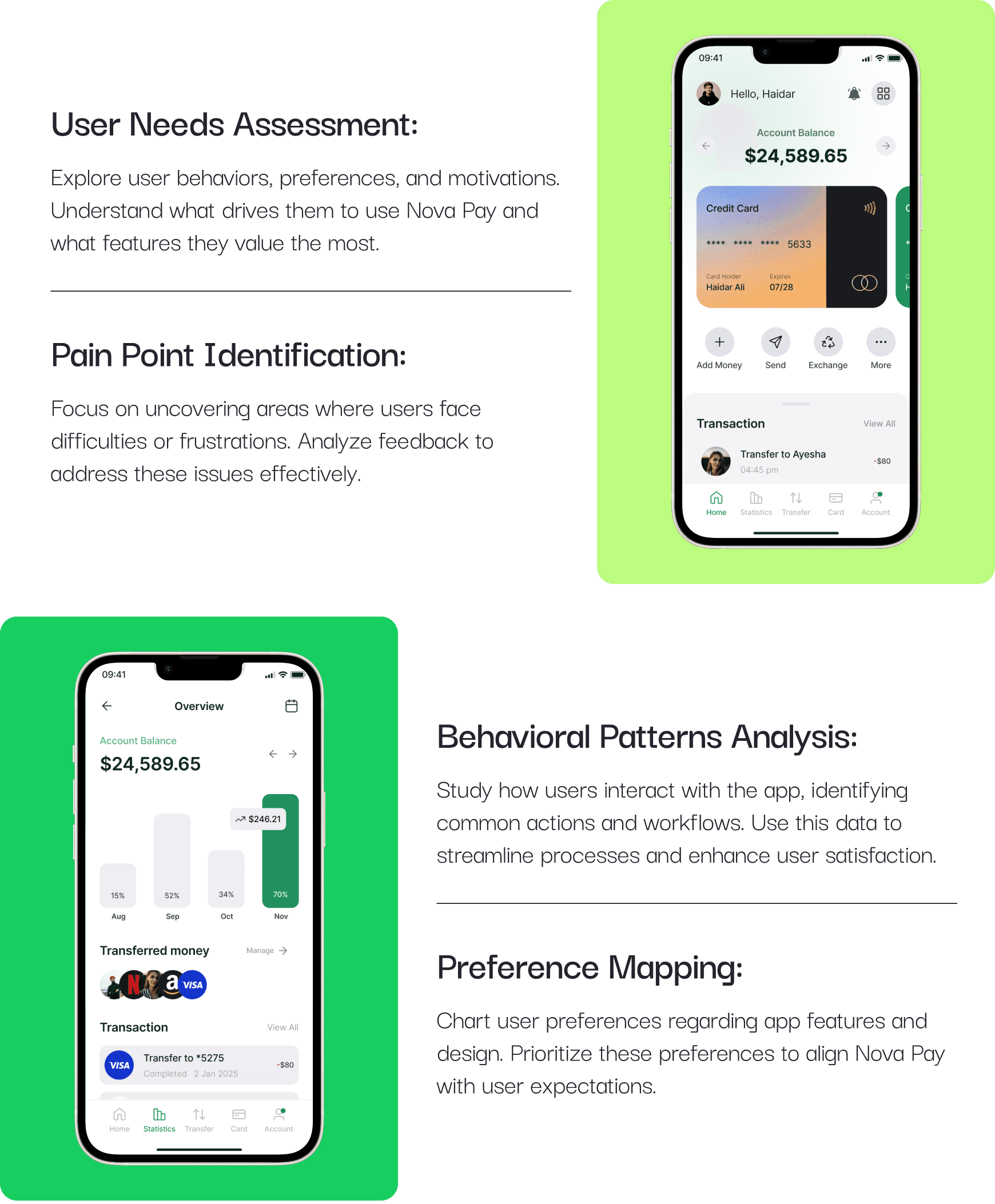 Nova Pay delivers a frictionless and trustworthy digital payment experience with a strong focus on clarity, speed, and financial empowerment. After launch, user testing revealed a 55% drop in transaction abandonment and a 70% satisfaction rate for ease of use. Nova Pay proves that in fintech, simplicity and security don’t have to be at odds—and that design can play a key role in building financial confidence.