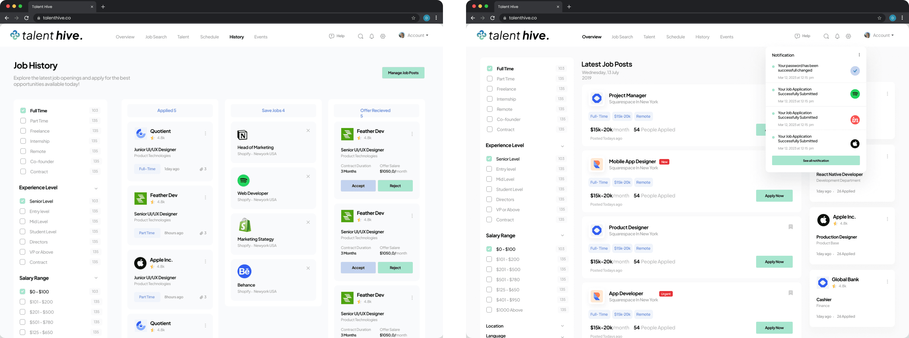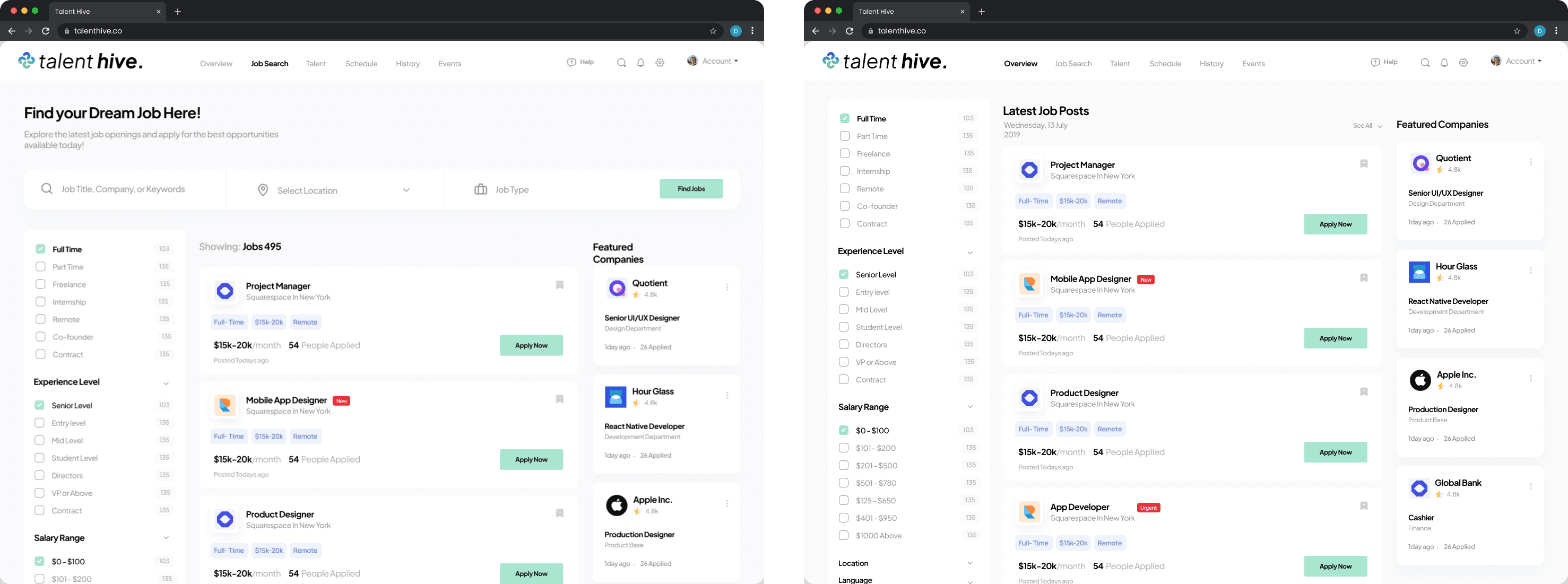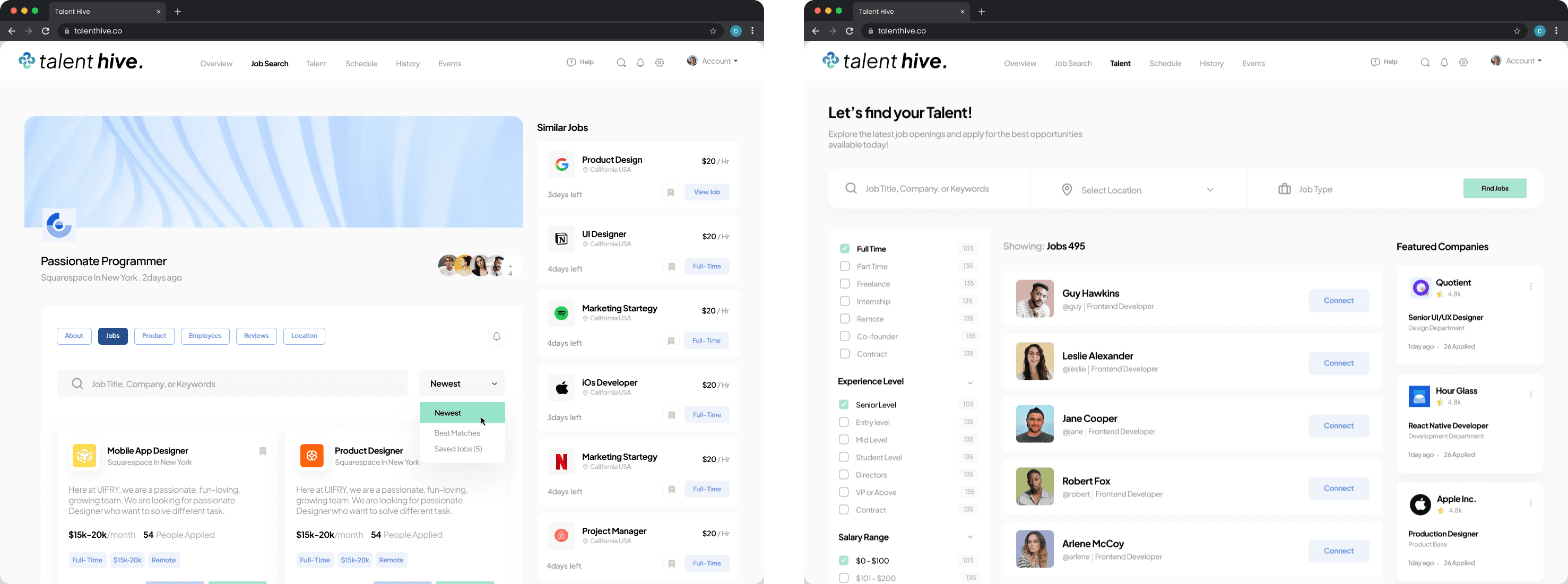 Talent Hive delivers an intuitive and effective job search experience. Through a clean UI/UX design, advanced search filters, and personalized recommendations, the app successfully bridges the gap between job seekers and employers, providing a smooth and satisfying experience for users at every stage.